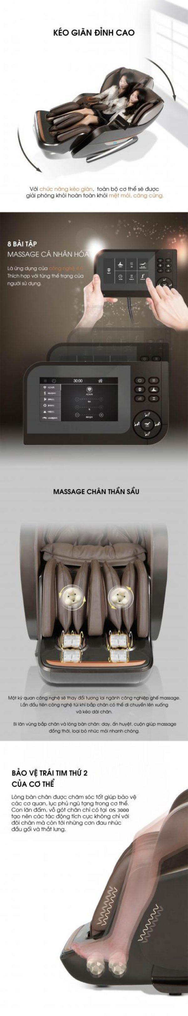 - Trong bài tập dảnh riêng cho dân văn phòng, phần bắp chân được đẩy lên sát đầu gối, chân gập vuông góc 90 độ, lưng ngả 180 độ, bi lưng sẽ chạy và miết từ cổ, vai , gáy và dọc theo cột sống.Khi ghế được trả về tư thế không trọng lượng bình thường, bi sẽ chuyển sang các bài đấm bóp. Cứ như vậy luôn phiên liên tục sẽ giải phóng hết các áp lực tích tụ ở cổ vai gáy cũng như tái tạo năng lượng toàn bộ cơ thể suốt 1 ngày dài làm việc.